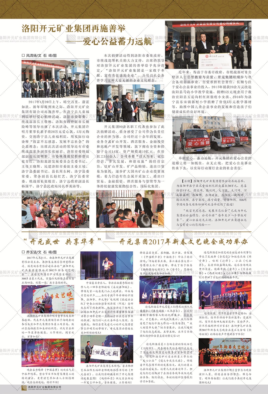 洛陽開元礦業(yè)集團有限公司簡介洛陽開元礦業(yè)集團有限公司,始成立于2006年,位于洛陽市開元大道269號。集團旗下共有五余家全資子公司,業(yè)務(wù)涉及有色金屬礦山開發(fā)、礦產(chǎn)品購銷與進出口貿(mào)易、房地產(chǎn)開發(fā)、文化藝術(shù)、企業(yè)管理與咨詢、資本投資等多個領(lǐng)域。民建河南省委委員、民建河南省委企業(yè)委副主任、民建洛陽市委委員、企業(yè)委主任、洛陽民建企業(yè)家協(xié)會會長許明月是公司創(chuàng)始人,現(xiàn)任洛陽開元礦業(yè)集團有限公司董事長。在礦業(yè)領(lǐng)域,洛陽開元礦業(yè)集團擁有多家實力雄厚的子公司:貴州開元礦業(yè)有限公司探、采礦權(quán)面積共11.33平方公里;興??h銅鑫礦業(yè)有限公司探礦權(quán)面積8.76平方公里,礦山資源潛力巨大;2021年,開元集團與盧氏中科礦業(yè)有限公司開展戰(zhàn)略合作。盧氏中科礦業(yè)有限公司專注于有色金屬的浮選、加工和銷售,擁有強大的技術(shù)支撐平臺,是集探、采、選、冶、研為一體的中大型綜合礦業(yè)企業(yè)。目前,盧氏中科王家河1000噸選礦廠已成功投產(chǎn),雙河金礦、柳關(guān)欒盧鉛鋅礦相繼順利開工,樓房銀礦與圪老灣鉛鋅礦的深部探礦重大突破,標志著礦山版圖取得重大進展,為開元集團后續(xù)發(fā)展奠定了堅實基礎(chǔ)。在文化傳媒領(lǐng)域,洛陽市明月美術(shù)館通過豐富多樣的藝術(shù)展覽、學術(shù)研討和公共教育活動,努力打造一個集展覽、交流、教育、研究為一體的綜合性藝術(shù)平臺。此外,在金融投資領(lǐng)域,開元集團旗下的北京明峰資本管理有限公司專注于投資具有高增長潛力的優(yōu)秀企業(yè),特別是高科技、新能源、環(huán)保等新興產(chǎn)業(yè),為客戶提供個性化的資產(chǎn)配置服務(wù)。在做好企業(yè)經(jīng)營的同時,開元集團始終不忘企業(yè)的社會責任和家國情懷,以突出的愛心公益事跡,開展了一系列公益慈善活動:“民建林”公益事業(yè)通過“思源基金”“幫幫公益”線上公益平臺,與眾多愛心人士籌措資金20余萬元;資助541名貧困大學生共計270余萬元,推進“數(shù)字助力——河南AI人才培養(yǎng)”;捐款10萬元,馳援京津冀、黑龍江洪水地質(zhì)災(zāi)害……公司于2017年底被洛陽市慈善總會評為“洛陽慈善風云榜——十大愛心集體”。洛陽開元礦業(yè)集團有限公司秉承持續(xù)發(fā)展理念,憑借多年來良好的企業(yè)信譽與經(jīng)營業(yè)績,與全國多家企業(yè)建立了良好合作關(guān)系,受到社會各界的一致好評,多次榮獲“納稅標兵”“先進企業(yè)”“招商引資模范企業(yè)”等榮譽稱號。回望來時路,開元人勠力同心,以“闖”的精神和“創(chuàng)”的勁頭,一路披荊斬棘,踏過千山萬水;展望新未來,開元人凝心聚力,不執(zhí)于“舊”,無畏于“新”,秉承“勇于跨越,追求卓越”的企業(yè)精神,乘著國家高質(zhì)量發(fā)展新征程的東風,跨過高山,越過大海,向著集團多元化、國際化的目標,逐夢遠航,跨越前行!