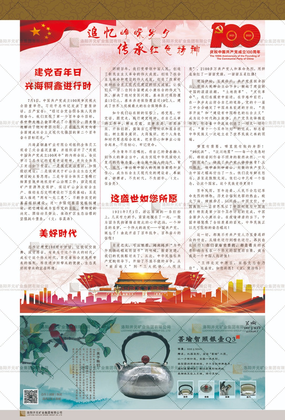 洛陽開元礦業(yè)集團(tuán)有限公司簡介洛陽開元礦業(yè)集團(tuán)有限公司,始成立于2006年,位于洛陽市開元大道269號。集團(tuán)旗下共有五余家全資子公司,業(yè)務(wù)涉及有色金屬礦山開發(fā)、礦產(chǎn)品購銷與進(jìn)出口貿(mào)易、房地產(chǎn)開發(fā)、文化藝術(shù)、企業(yè)管理與咨詢、資本投資等多個領(lǐng)域。民建河南省委委員、民建河南省委企業(yè)委副主任、民建洛陽市委委員、企業(yè)委主任、洛陽民建企業(yè)家協(xié)會會長許明月是公司創(chuàng)始人,現(xiàn)任洛陽開元礦業(yè)集團(tuán)有限公司董事長。在礦業(yè)領(lǐng)域,洛陽開元礦業(yè)集團(tuán)擁有多家實(shí)力雄厚的子公司:貴州開元礦業(yè)有限公司探、采礦權(quán)面積共11.33平方公里;興??h銅鑫礦業(yè)有限公司探礦權(quán)面積8.76平方公里,礦山資源潛力巨大;2021年,開元集團(tuán)與盧氏中科礦業(yè)有限公司開展戰(zhàn)略合作。盧氏中科礦業(yè)有限公司專注于有色金屬的浮選、加工和銷售,擁有強(qiáng)大的技術(shù)支撐平臺,是集探、采、選、冶、研為一體的中大型綜合礦業(yè)企業(yè)。目前,盧氏中科王家河1000噸選礦廠已成功投產(chǎn),雙河金礦、柳關(guān)欒盧鉛鋅礦相繼順利開工,樓房銀礦與圪老灣鉛鋅礦的深部探礦重大突破,標(biāo)志著礦山版圖取得重大進(jìn)展,為開元集團(tuán)后續(xù)發(fā)展奠定了堅(jiān)實(shí)基礎(chǔ)。在文化傳媒領(lǐng)域,洛陽市明月美術(shù)館通過豐富多樣的藝術(shù)展覽、學(xué)術(shù)研討和公共教育活動,努力打造一個集展覽、交流、教育、研究為一體的綜合性藝術(shù)平臺。此外,在金融投資領(lǐng)域,開元集團(tuán)旗下的北京明峰資本管理有限公司專注于投資具有高增長潛力的優(yōu)秀企業(yè),特別是高科技、新能源、環(huán)保等新興產(chǎn)業(yè),為客戶提供個性化的資產(chǎn)配置服務(wù)。在做好企業(yè)經(jīng)營的同時,開元集團(tuán)始終不忘企業(yè)的社會責(zé)任和家國情懷,以突出的愛心公益事跡,開展了一系列公益慈善活動:“民建林”公益事業(yè)通過“思源基金”“幫幫公益”線上公益平臺,與眾多愛心人士籌措資金20余萬元;資助541名貧困大學(xué)生共計270余萬元,推進(jìn)“數(shù)字助力——河南AI人才培養(yǎng)”;捐款10萬元,馳援京津冀、黑龍江洪水地質(zhì)災(zāi)害……公司于2017年底被洛陽市慈善總會評為“洛陽慈善風(fēng)云榜——十大愛心集體”。洛陽開元礦業(yè)集團(tuán)有限公司秉承持續(xù)發(fā)展理念,憑借多年來良好的企業(yè)信譽(yù)與經(jīng)營業(yè)績,與全國多家企業(yè)建立了良好合作關(guān)系,受到社會各界的一致好評,多次榮獲“納稅標(biāo)兵”“先進(jìn)企業(yè)”“招商引資模范企業(yè)”等榮譽(yù)稱號?;赝麃頃r路,開元人勠力同心,以“闖”的精神和“創(chuàng)”的勁頭,一路披荊斬棘,踏過千山萬水;展望新未來,開元人凝心聚力,不執(zhí)于“舊”,無畏于“新”,秉承“勇于跨越,追求卓越”的企業(yè)精神,乘著國家高質(zhì)量發(fā)展新征程的東風(fēng),跨過高山,越過大海,向著集團(tuán)多元化、國際化的目標(biāo),逐夢遠(yuǎn)航,跨越前行!