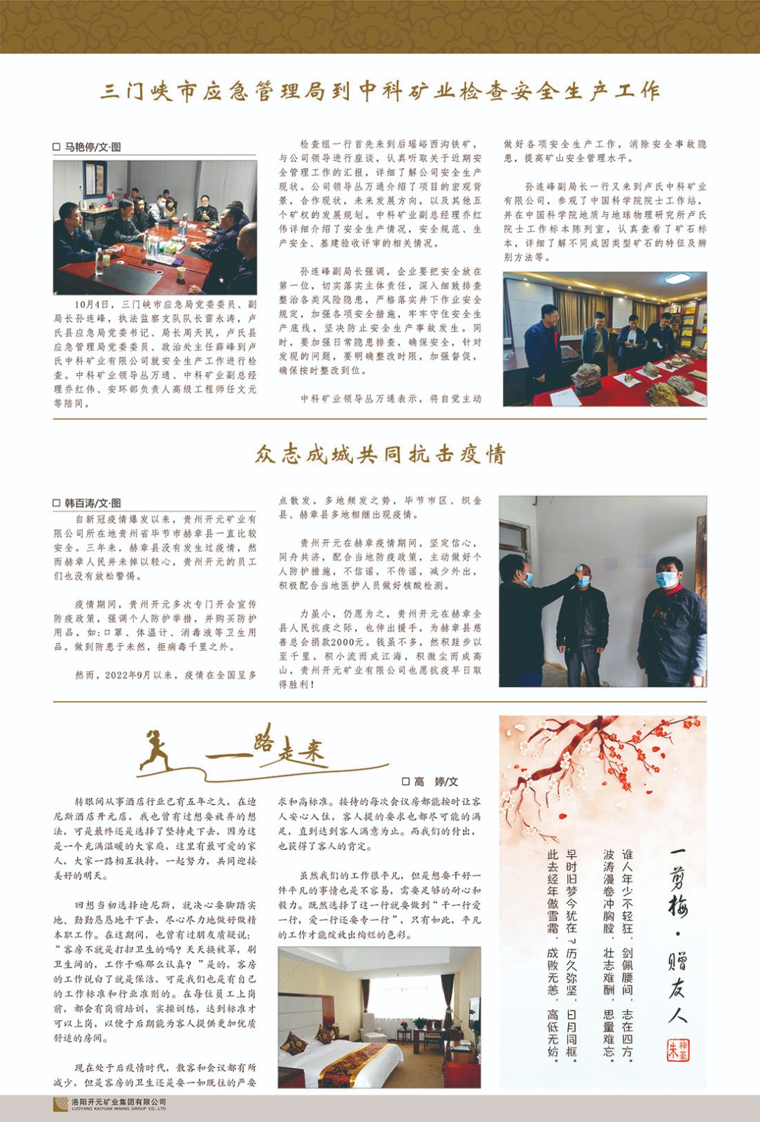 洛陽(yáng)開(kāi)元礦業(yè)集團(tuán)有限公司簡(jiǎn)介洛陽(yáng)開(kāi)元礦業(yè)集團(tuán)有限公司,始成立于2006年,位于洛陽(yáng)市開(kāi)元大道269號(hào)。集團(tuán)旗下共有五余家全資子公司,業(yè)務(wù)涉及有色金屬礦山開(kāi)發(fā)、礦產(chǎn)品購(gòu)銷(xiāo)與進(jìn)出口貿(mào)易、房地產(chǎn)開(kāi)發(fā)、文化藝術(shù)、企業(yè)管理與咨詢(xún)、資本投資等多個(gè)領(lǐng)域。民建河南省委委員、民建河南省委企業(yè)委副主任、民建洛陽(yáng)市委委員、企業(yè)委主任、洛陽(yáng)民建企業(yè)家協(xié)會(huì)會(huì)長(zhǎng)許明月是公司創(chuàng)始人,現(xiàn)任洛陽(yáng)開(kāi)元礦業(yè)集團(tuán)有限公司董事長(zhǎng)。在礦業(yè)領(lǐng)域,洛陽(yáng)開(kāi)元礦業(yè)集團(tuán)擁有多家實(shí)力雄厚的子公司:貴州開(kāi)元礦業(yè)有限公司探、采礦權(quán)面積共11.33平方公里;興??h銅鑫礦業(yè)有限公司探礦權(quán)面積8.76平方公里,礦山資源潛力巨大;2021年,開(kāi)元集團(tuán)與盧氏中科礦業(yè)有限公司開(kāi)展戰(zhàn)略合作。盧氏中科礦業(yè)有限公司專(zhuān)注于有色金屬的浮選、加工和銷(xiāo)售,擁有強(qiáng)大的技術(shù)支撐平臺(tái),是集探、采、選、冶、研為一體的中大型綜合礦業(yè)企業(yè)。目前,盧氏中科王家河1000噸選礦廠已成功投產(chǎn),雙河金礦、柳關(guān)欒盧鉛鋅礦相繼順利開(kāi)工,樓房銀礦與圪老灣鉛鋅礦的深部探礦重大突破,標(biāo)志著礦山版圖取得重大進(jìn)展,為開(kāi)元集團(tuán)后續(xù)發(fā)展奠定了堅(jiān)實(shí)基礎(chǔ)。在文化傳媒領(lǐng)域,洛陽(yáng)市明月美術(shù)館通過(guò)豐富多樣的藝術(shù)展覽、學(xué)術(shù)研討和公共教育活動(dòng),努力打造一個(gè)集展覽、交流、教育、研究為一體的綜合性藝術(shù)平臺(tái)。此外,在金融投資領(lǐng)域,開(kāi)元集團(tuán)旗下的北京明峰資本管理有限公司專(zhuān)注于投資具有高增長(zhǎng)潛力的優(yōu)秀企業(yè),特別是高科技、新能源、環(huán)保等新興產(chǎn)業(yè),為客戶(hù)提供個(gè)性化的資產(chǎn)配置服務(wù)。在做好企業(yè)經(jīng)營(yíng)的同時(shí),開(kāi)元集團(tuán)始終不忘企業(yè)的社會(huì)責(zé)任和家國(guó)情懷,以突出的愛(ài)心公益事跡,開(kāi)展了一系列公益慈善活動(dòng):“民建林”公益事業(yè)通過(guò)“思源基金”“幫幫公益”線(xiàn)上公益平臺(tái),與眾多愛(ài)心人士籌措資金20余萬(wàn)元;資助541名貧困大學(xué)生共計(jì)270余萬(wàn)元,推進(jìn)“數(shù)字助力——河南AI人才培養(yǎng)”;捐款10萬(wàn)元,馳援京津冀、黑龍江洪水地質(zhì)災(zāi)害……公司于2017年底被洛陽(yáng)市慈善總會(huì)評(píng)為“洛陽(yáng)慈善風(fēng)云榜——十大愛(ài)心集體”。洛陽(yáng)開(kāi)元礦業(yè)集團(tuán)有限公司秉承持續(xù)發(fā)展理念,憑借多年來(lái)良好的企業(yè)信譽(yù)與經(jīng)營(yíng)業(yè)績(jī),與全國(guó)多家企業(yè)建立了良好合作關(guān)系,受到社會(huì)各界的一致好評(píng),多次榮獲“納稅標(biāo)兵”“先進(jìn)企業(yè)”“招商引資模范企業(yè)”等榮譽(yù)稱(chēng)號(hào)?;赝麃?lái)時(shí)路,開(kāi)元人勠力同心,以“闖”的精神和“創(chuàng)”的勁頭,一路披荊斬棘,踏過(guò)千山萬(wàn)水;展望新未來(lái),開(kāi)元人凝心聚力,不執(zhí)于“舊”,無(wú)畏于“新”,秉承“勇于跨越,追求卓越”的企業(yè)精神,乘著國(guó)家高質(zhì)量發(fā)展新征程的東風(fēng),跨過(guò)高山,越過(guò)大海,向著集團(tuán)多元化、國(guó)際化的目標(biāo),逐夢(mèng)遠(yuǎn)航,跨越前行!