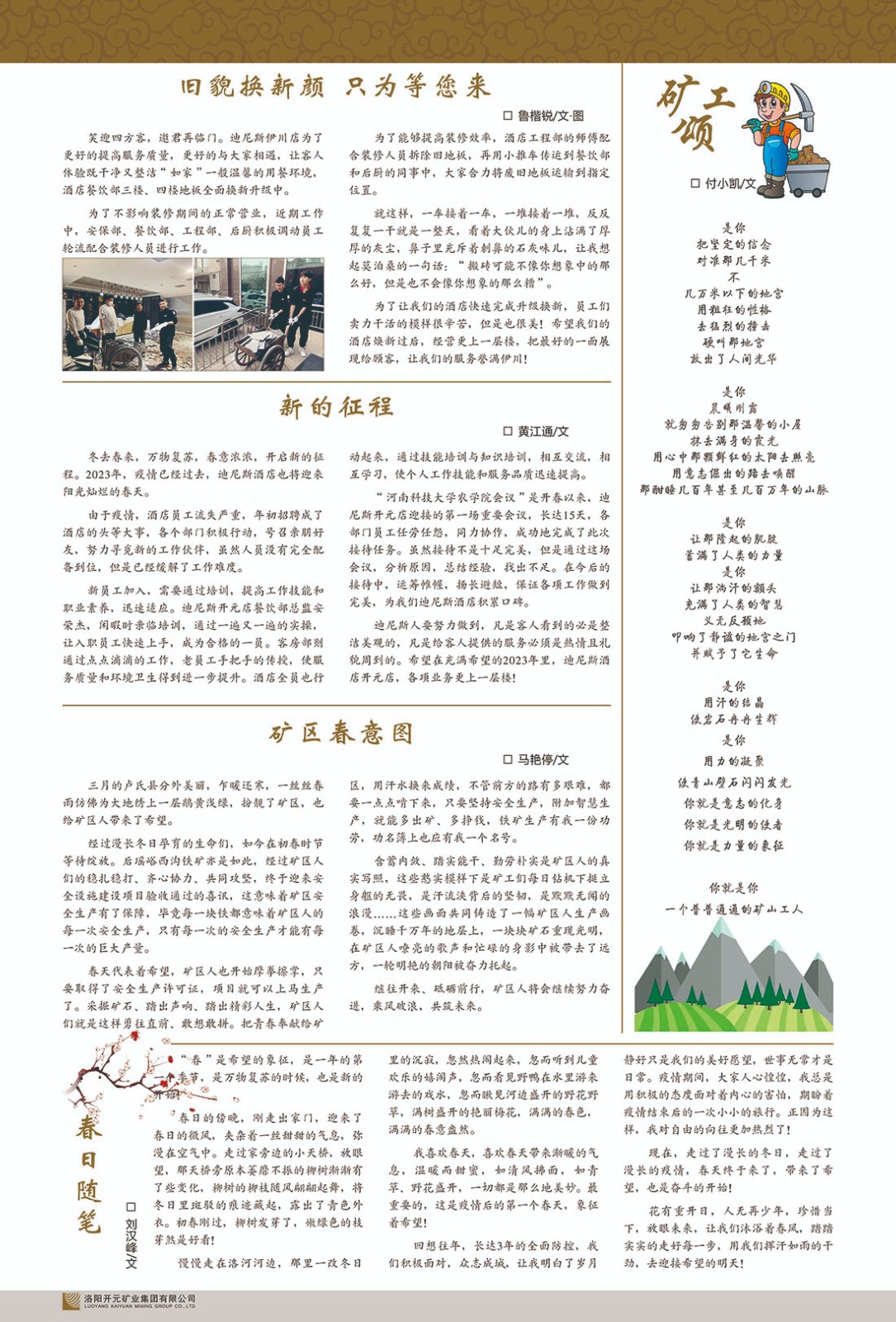 洛陽開元礦業(yè)集團有限公司簡介洛陽開元礦業(yè)集團有限公司,始成立于2006年,位于洛陽市開元大道269號。集團旗下共有五余家全資子公司,業(yè)務涉及有色金屬礦山開發(fā)、礦產品購銷與進出口貿易、房地產開發(fā)、文化藝術、企業(yè)管理與咨詢、資本投資等多個領域。民建河南省委委員、民建河南省委企業(yè)委副主任、民建洛陽市委委員、企業(yè)委主任、洛陽民建企業(yè)家協(xié)會會長許明月是公司創(chuàng)始人,現(xiàn)任洛陽開元礦業(yè)集團有限公司董事長。在礦業(yè)領域,洛陽開元礦業(yè)集團擁有多家實力雄厚的子公司:貴州開元礦業(yè)有限公司探、采礦權面積共11.33平方公里;興??h銅鑫礦業(yè)有限公司探礦權面積8.76平方公里,礦山資源潛力巨大;2021年,開元集團與盧氏中科礦業(yè)有限公司開展戰(zhàn)略合作。盧氏中科礦業(yè)有限公司專注于有色金屬的浮選、加工和銷售,擁有強大的技術支撐平臺,是集探、采、選、冶、研為一體的中大型綜合礦業(yè)企業(yè)。目前,盧氏中科王家河1000噸選礦廠已成功投產,雙河金礦、柳關欒盧鉛鋅礦相繼順利開工,樓房銀礦與圪老灣鉛鋅礦的深部探礦重大突破,標志著礦山版圖取得重大進展,為開元集團后續(xù)發(fā)展奠定了堅實基礎。在文化傳媒領域,洛陽市明月美術館通過豐富多樣的藝術展覽、學術研討和公共教育活動,努力打造一個集展覽、交流、教育、研究為一體的綜合性藝術平臺。此外,在金融投資領域,開元集團旗下的北京明峰資本管理有限公司專注于投資具有高增長潛力的優(yōu)秀企業(yè),特別是高科技、新能源、環(huán)保等新興產業(yè),為客戶提供個性化的資產配置服務。在做好企業(yè)經營的同時,開元集團始終不忘企業(yè)的社會責任和家國情懷,以突出的愛心公益事跡,開展了一系列公益慈善活動:“民建林”公益事業(yè)通過“思源基金”“幫幫公益”線上公益平臺,與眾多愛心人士籌措資金20余萬元;資助541名貧困大學生共計270余萬元,推進“數字助力——河南AI人才培養(yǎng)”;捐款10萬元,馳援京津冀、黑龍江洪水地質災害……公司于2017年底被洛陽市慈善總會評為“洛陽慈善風云榜——十大愛心集體”。洛陽開元礦業(yè)集團有限公司秉承持續(xù)發(fā)展理念,憑借多年來良好的企業(yè)信譽與經營業(yè)績,與全國多家企業(yè)建立了良好合作關系,受到社會各界的一致好評,多次榮獲“納稅標兵”“先進企業(yè)”“招商引資模范企業(yè)”等榮譽稱號。回望來時路,開元人勠力同心,以“闖”的精神和“創(chuàng)”的勁頭,一路披荊斬棘,踏過千山萬水;展望新未來,開元人凝心聚力,不執(zhí)于“舊”,無畏于“新”,秉承“勇于跨越,追求卓越”的企業(yè)精神,乘著國家高質量發(fā)展新征程的東風,跨過高山,越過大海,向著集團多元化、國際化的目標,逐夢遠航,跨越前行!